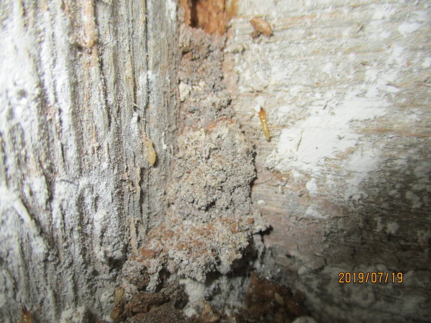 K様借家でヤマトシロアリの羽アリ発生。※写真は床下で確認した兵蟻(右)と働蟻(左)。借家の母屋と離れ、両方の工事ご依頼を頂きました。