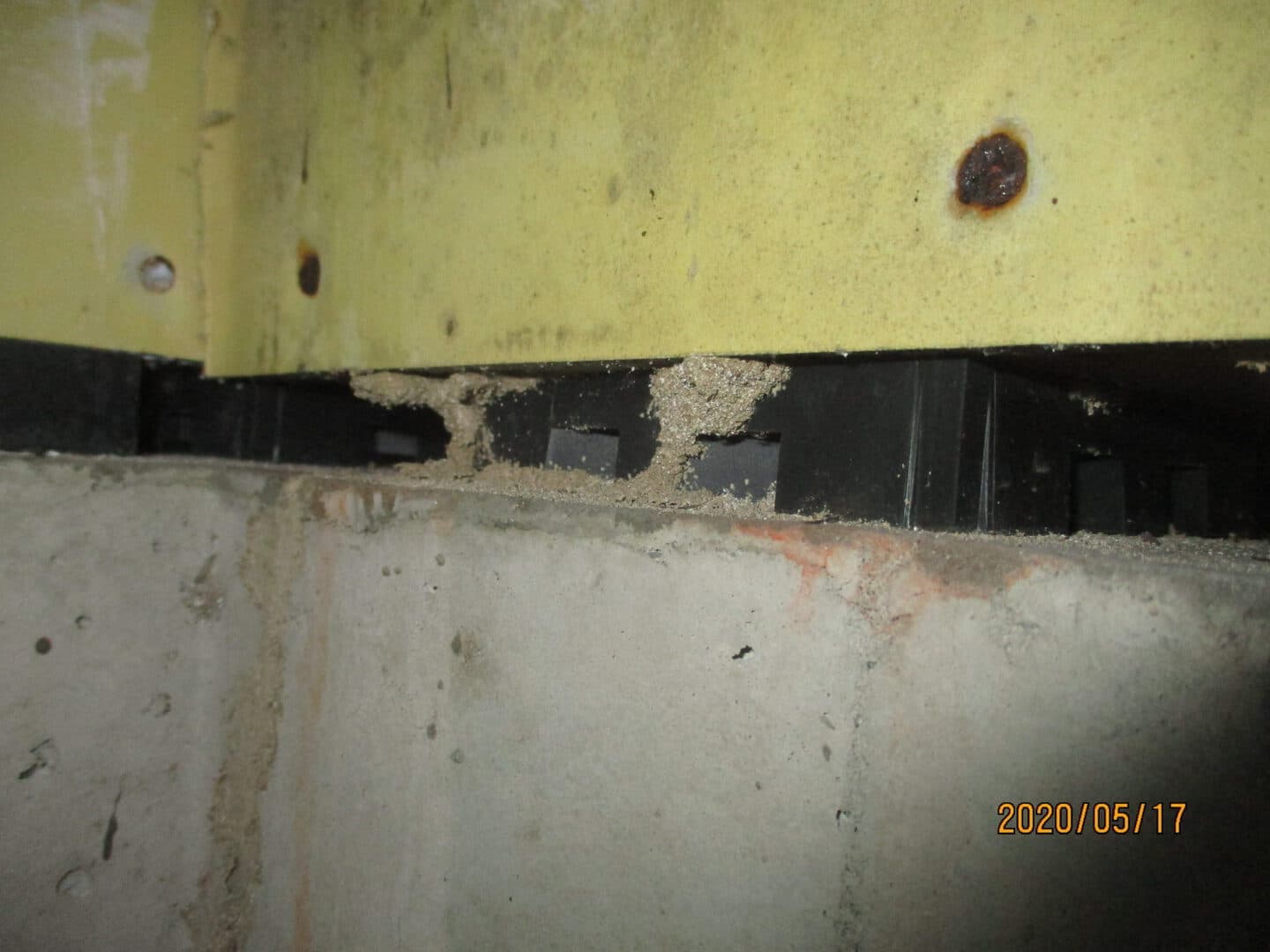 基礎パッキンをつたってシロアリが土台へ侵入しているケース。(写真の中央、土のようなものがシロアリが作るトンネルのような蟻道と呼ばれる道)シロアリが入らないと言われてますが実際の現場ではあまり関係なく被害は発生しています。
